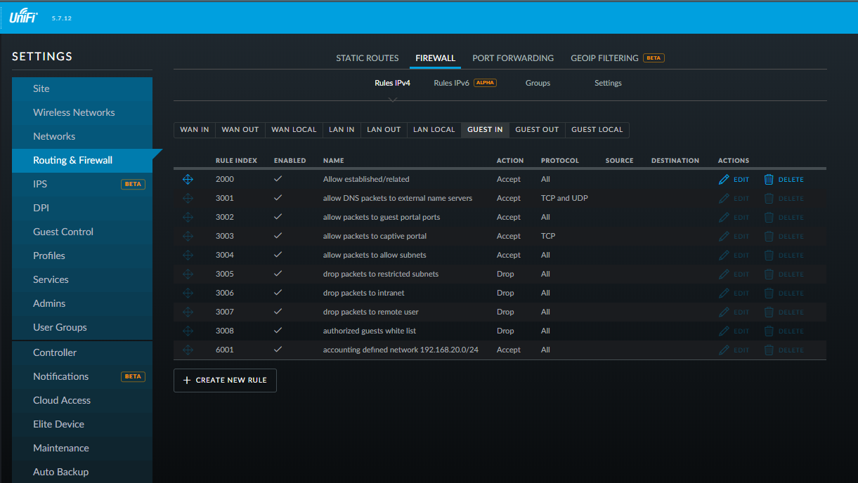 Denetleyicide görünmese de, üç LAN kural kümesinin her birinin varsayılan bir “Kabul Et” eylemi vardır. UniFi yöneticileri, güvenlik ve / veya uyumun arttırılması için bir bırakma kuralı oluşturmak ve buna göre yerleştirmek zorunda kalabilir.