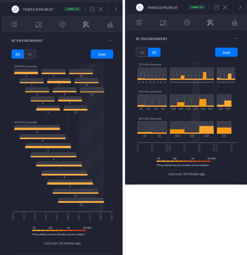 Bu pencerelerde, hangi kanalların tıkanık olduğunu görebilir ve kanalınızı en az kullanılan ve çevreleyen spektrumu kullanacak şekilde ayarlayabilirsiniz. Bu hem 2.4GHz hem de 5.8GHz için geçerlidir. En iyi uygulama, bitişik kanallardan en az 20MHz ayırmaya sahip olmaktır.